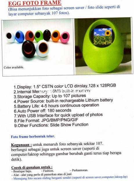Abadikan kumpulan / koleksi foto-foto kenangan atau foto-foto pada moment yang terpenting bersama orang-orang yg dikasihi dalam kehidupan anda ( berupa softcopy foto) dengan Digital Foto Frame LCD EGG yang dikemas dengan bentuk mini / gantungan kunci dan ringan sehingga mudah dibawa bepergian.